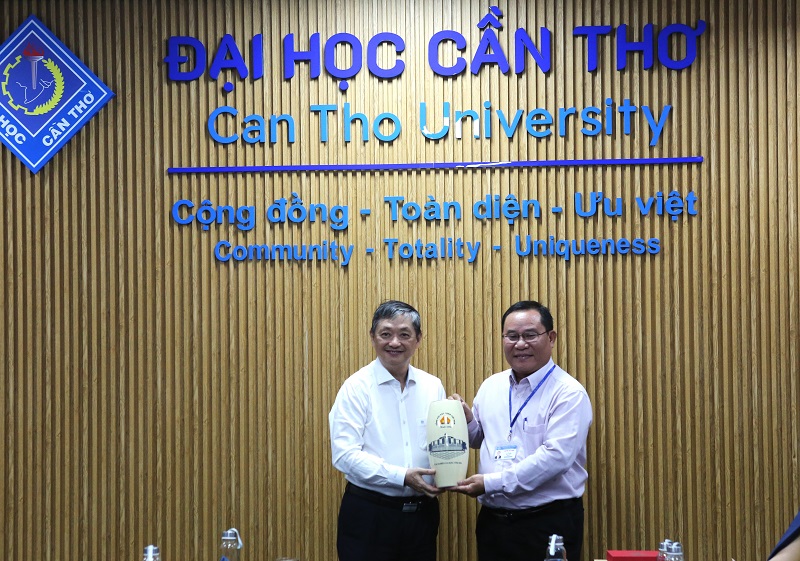 Chủ tịch Tổng hội Xây dựng Việt Nam tặng quà lưu niệm của Tổng hội cho Đại học Cần Thơ.