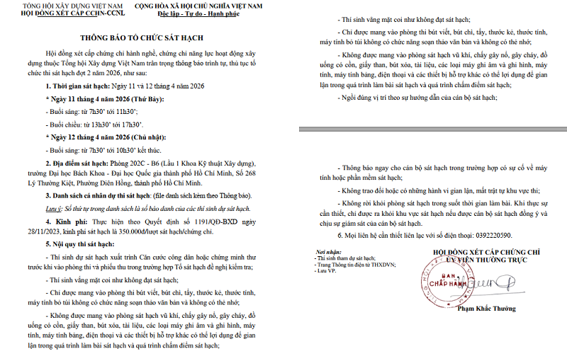 Hội đồng xét cấp chứng chỉ hành nghề, chứng chỉ năng lực hoạt động xây dựng Tổng hội Xây dựng Việt Nam vừa có Thông báo về tổ chức thi sát hạch đợt 2 năm 2026.