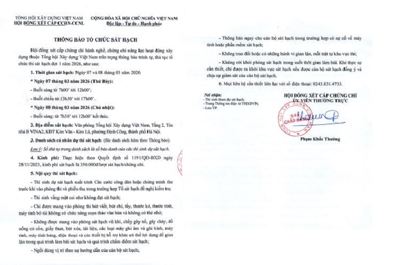 Hội đồng xét cấp chứng chỉ hành nghề, chứng chỉ năng lực hoạt động xây dựng Tổng hội Xây dựng Việt Nam vừa có Thông báo về tổ chức thi sát hạch đợt 1 năm 2026.