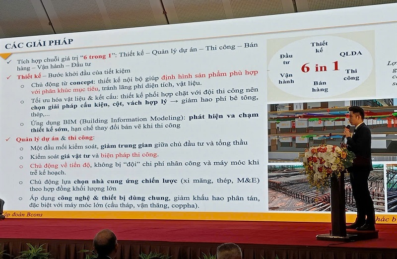 Theo ông Kiệt, Bcons có lợi thế trong chuỗi giá trị 6 trong 1 gồm: Thiết kế - Quản lý dự án - Thi công - Bán hàng - Vận hành - Đầu tư. "Với vòng tròn khép kín không phải qua trung gian Bcons đã tiết kiệm được chi phí tối đa qua đó giảm được giá thành căn hộ xuống thấp nhất", ông Kiệt trình bày.