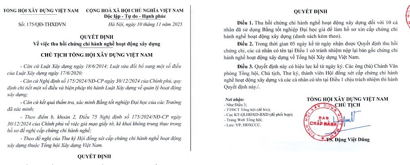 Tổng hội Xây dựng Việt Nam đã quyết định thu hồi chứng chỉ hành nghề xây dựng và xóa tư cách hội viên đối với 10 cá nhân sử dụng bằng đại học giả.