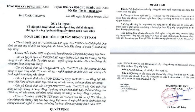 Ngày 28/10, TS. Đặng Việt Dũng - Chủ tịch Tổng hội Xây dựng Việt Nam ký Quyết định số 170/QĐ-THXDVN về việc phê duyệt danh sách cấp chứng chỉ hành nghề, chứng chỉ năng lực hoạt động xây dựng đợt 8 năm 2025.