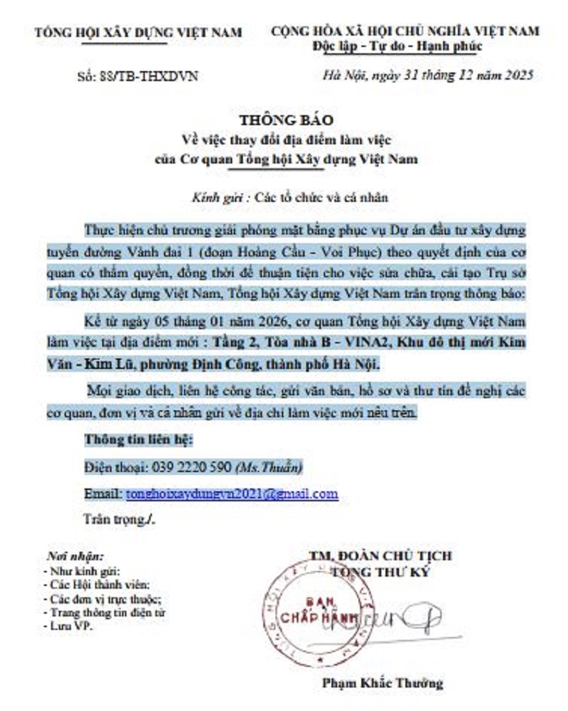 Theo đó, kể từ ngày 05 tháng 01 năm 2026, cơ quan Tổng hội Xây dựng Việt Nam làm việc tại địa điểm mới : Tầng 2, Tòa nhà B - VINA2, Khu đô thị mới Kim Văn - Kim Lũ, phường Định Công, TP Hà Nội.